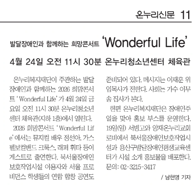 HOME > Ä¿¹Â´ÏƼ > È«º¸È°µ¿| Á¦¸ñ | [¿Â´©¸®½Å¹®] ¹ß´ÞÀå¾ÖÀΰú ÇÔ²²ÇÏ´Â Èñ¸ÁÄܼƮ 'Wonderful Life' | ||