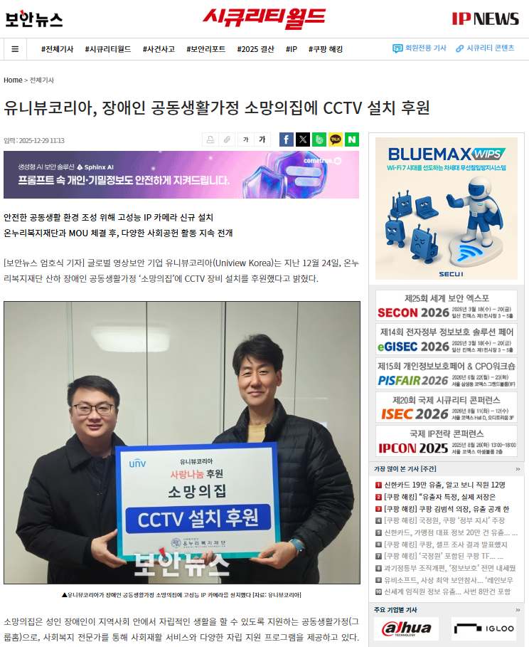 [½ÃÅ¥¸®Æ¼¿ùµå] À¯´ÏºäÄÚ¸®¾Æ, Àå¾ÖÀΰøµ¿»ýȰ°¡Á¤ ¼Ò¸ÁÀÇÁý¿¡ CCTV ¼³Ä¡ ÈÄ¿ø
