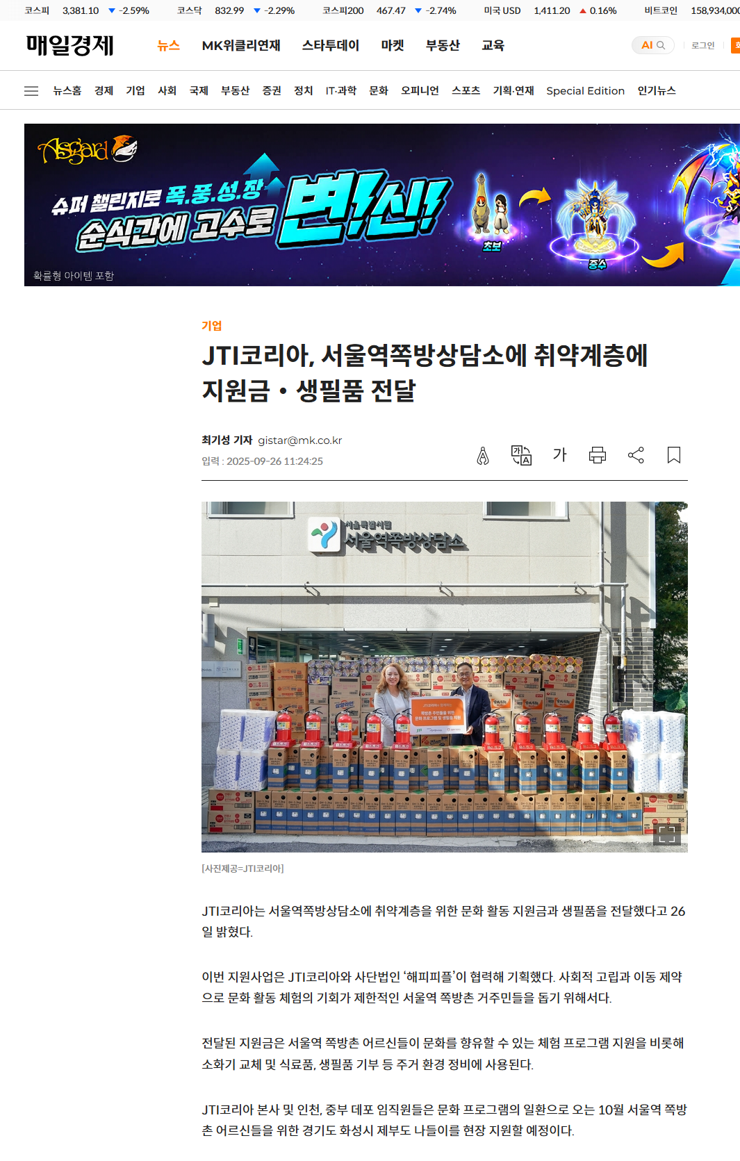 [¸ÅÀϰæÁ¦] JTIÄÚ¸®¾Æ, ¼¿ï¿ªÂʹæ»ó´ã¼Ò¿¡ Ãë¾à°èÃþ¿¡ Áö¿ø±Ý‧»ýÇÊǰ Àü´Þ